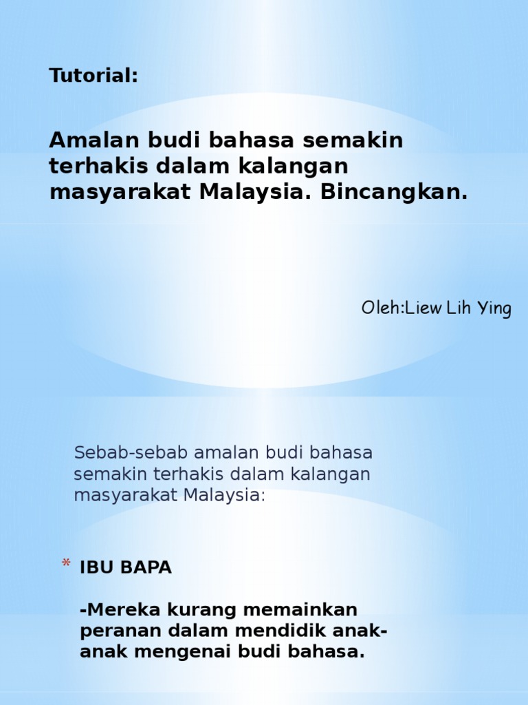 Kepentingan budi bahasa dalam masyarakat malaysia secara berkesan.pada era globalisasi yang mengharungi ledakan sains dan teknologi ini, budaya berbudi bahasa dalam kalangan masyarakat semakin pudar dan lenyap dalam diri sanubari masyarakat malaysia.