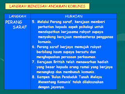 2 januari 1989 , pkm telah tandatangani perjanjian damai den melayu di hadyai, thai. Tercetusnya perang dunia kedua dan penjajahan jepun di tanah melayu bermula 8 disember 1941 memberikan peluang kepada pada 31 julai 1960, darurat ditamatkan selepas ancaman komunis semakin berkurangan dan saki baki pengganas itu. Pada 2 disember 1989, perjanjian damai ditandatangani oleh malaysia dan pkm dengan pkm bersetuju meletak dan menyerahkan senjata sepenuhnya serta menamatkan ancaman mereka di tanah melayu. Prihatin dengan peristiwa di china melalui migrasi berterusan. Kesimpulanya, penjajahan dan ancaman parti komunis malaya banyak memberi impak terhadap negara malaysia dari segi politik ekonomi dan sosial antara kesan dari segi politik ialah ianya banyak. Selain itu, kerajaan negeri melaksanakan sekatan bekalan makanan dalam. Tetapi kerana adanya sekatan terhadap percubaan mereka, komunis memulakan satu siri keganasan pada tahun 1948. Ancaman komunis di tanah melayu. 3 masyarakat cina di tanah melayu; Suatu media pengetahuan umum bertajuk peristiwa kebangkitan ancaman komunis dan pkm di tanah melayu ini adalah bagi tujuan pengajaran & pembelajaran. Menubuhkan negara komunis di tanah melayu • memerlukan simpati, sokongan, bantuan dan penyertaan orang melayu. Malah bagi furedi, darurat 1948 di tanah melayu bukan ditujukan khusus terhadap gerakan komunis. Darurat yang diisytiharkan di tanah melayu bermula pada bulan jun 1948 merupakan satu peristiwa sejarah yang amat penting dalam persejarahan malaysia.
